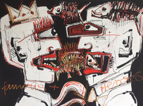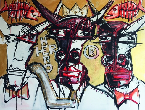 Alpha Animals, Famous Heroes, King Torros are portraits and experiences which are from us now. With the highest emotion, in borderline situations. Loss. Victory. Fear. The nose is crooked, the eye is drooping. Mario Sprinz draws what makes us special, what makes us famous and what makes us an Alpha animal. Do you only see the spitting fish? Do you hear the screaming? The crown is crooked, do you see that it wobbles, does it hurt? Do you feel that it speaks to you, are you touched? Is there a dialogue between you and a picture or do you remain distant, untouched? Each picture tells its own story, including one of yours stories.